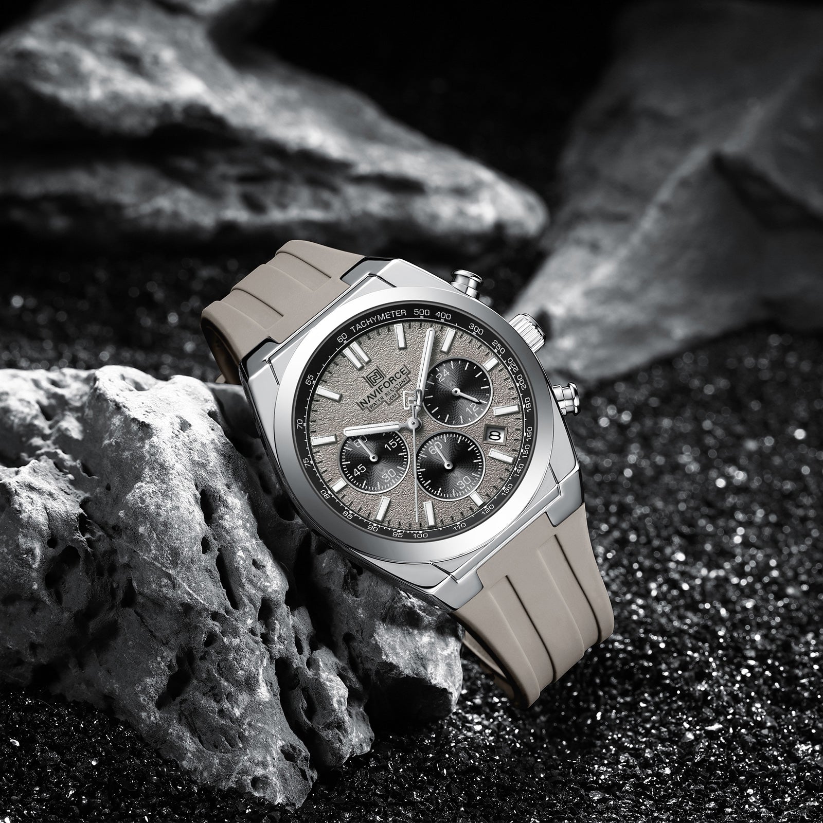 - Octagonal Luxury Chronograph with Granular Stone-Texture Dial